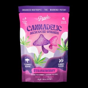 Purple Cannadelic Microdose Gummies Come in a 10ct resealed Pouch. Each Fruity, Juicy Flavor-packed Gummy Contains a 600mg proprietary Blend of THC-V and Magic Mushrooms!
